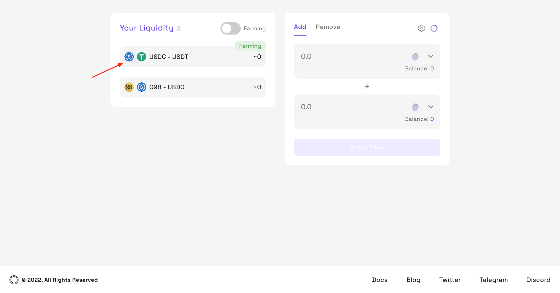 Step 3: 토큰 페어를 선택하고 추가하고자 하는 유동성 수량을 입력한 뒤 → Supply를 클릭합니다.