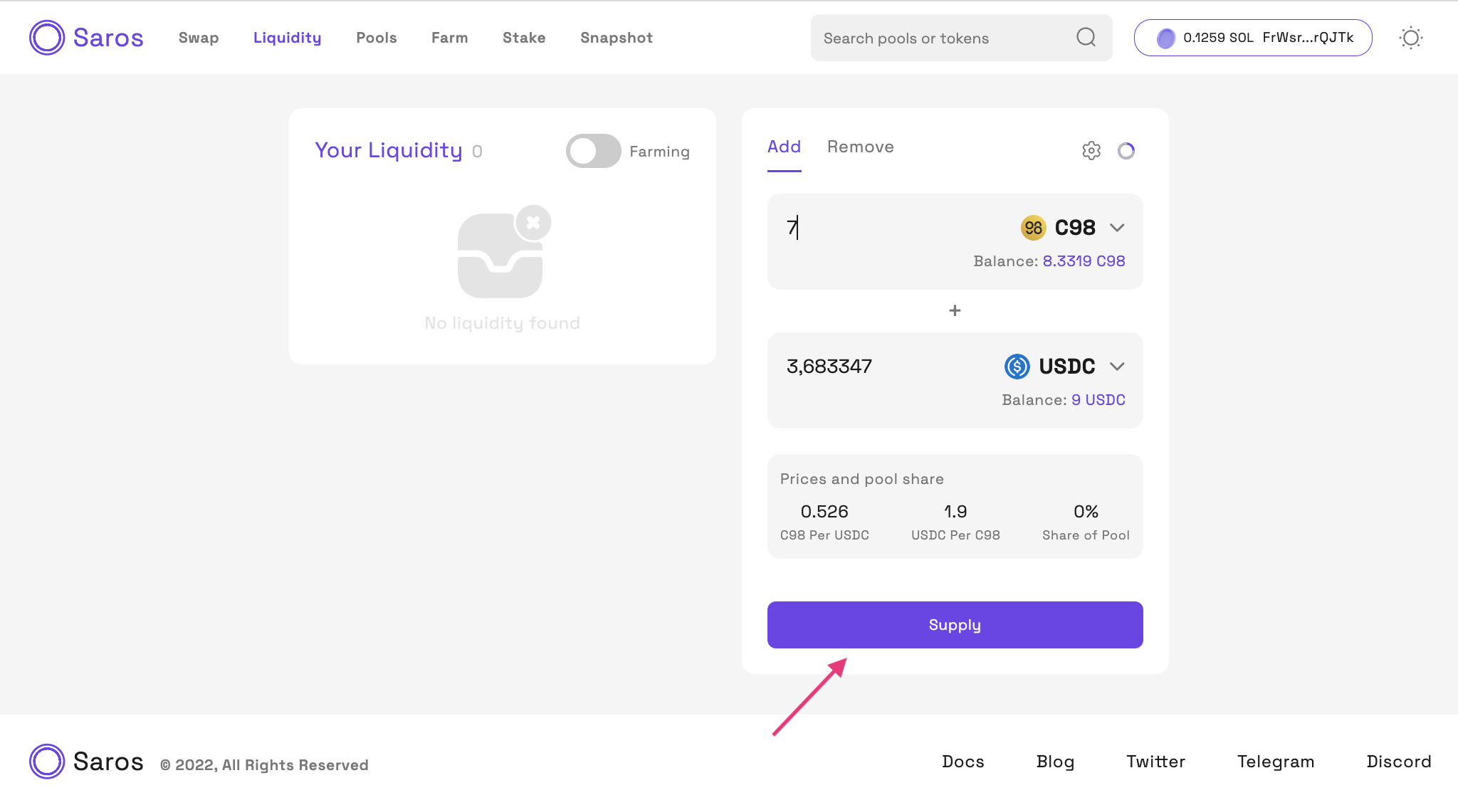 Saros Finance에서 유동성 추가하기: