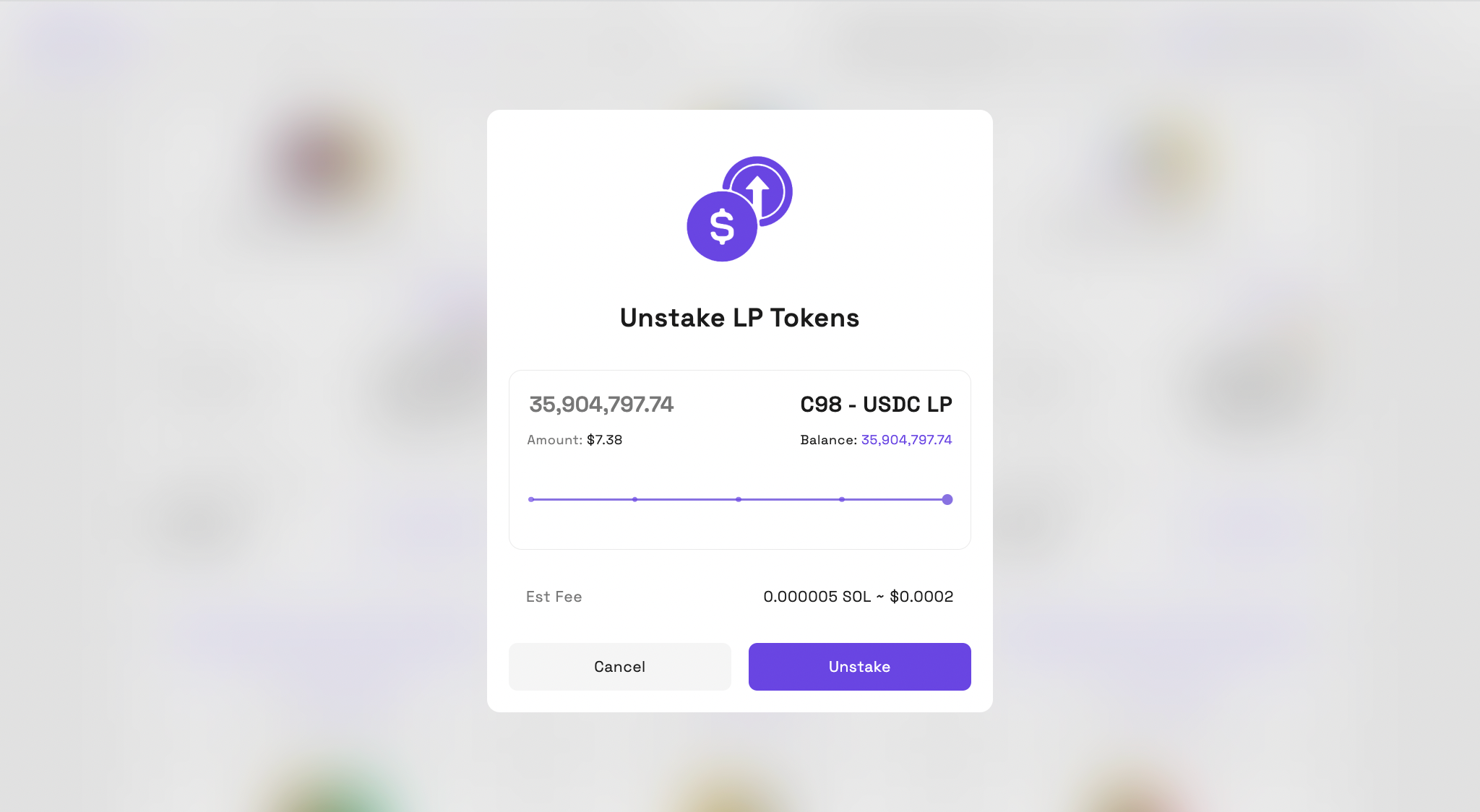 Step 2: 언스테이킹할 LP 토큰 수량을 선택하고, 가스 수수료를 확인한 뒤 -> Unstake LP Tokens 버튼을 클릭합니다.
