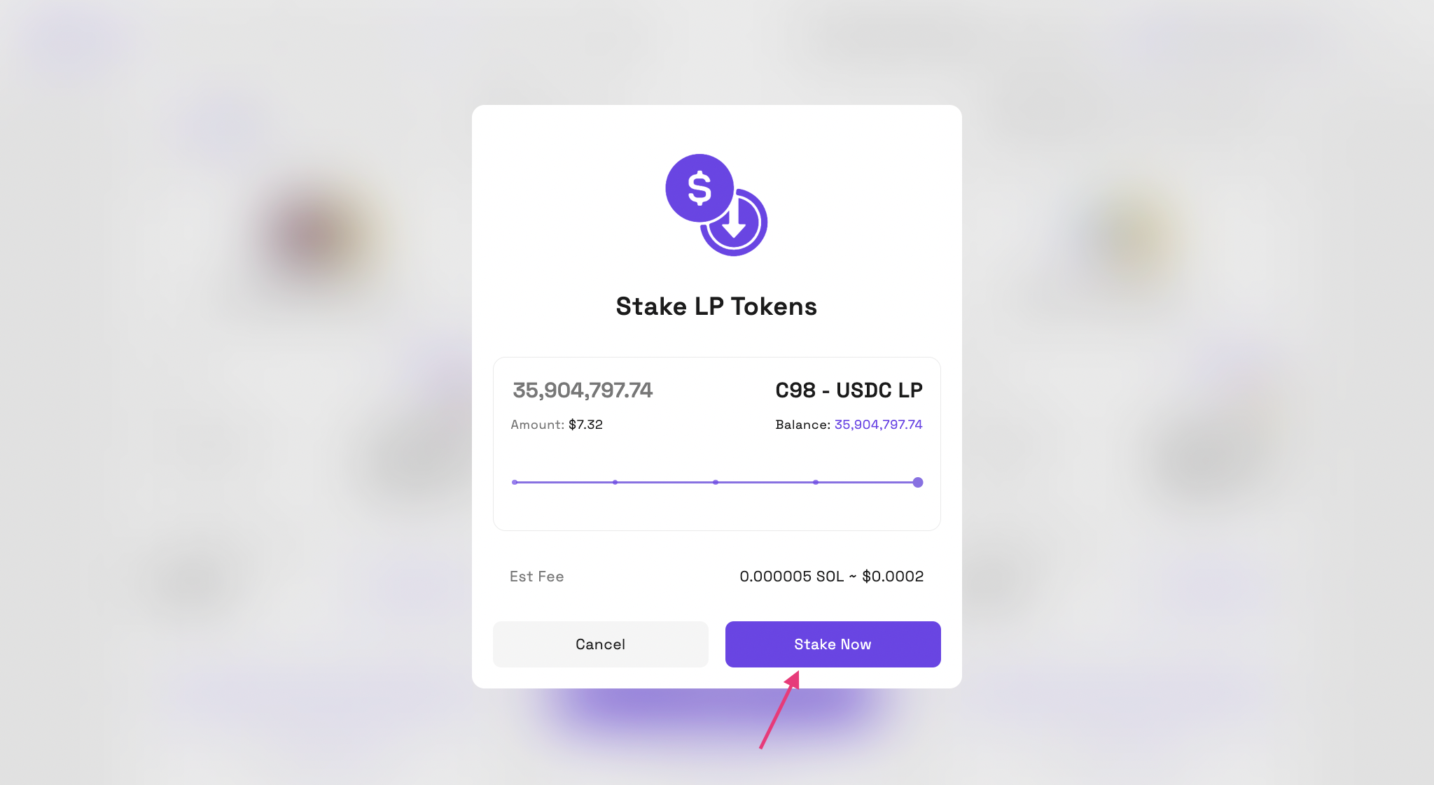Step 3: 스테이킹하고자 하는 LP 토큰의 수량을 선택하고, 가스 수수료(Gas fee)를 확인한 뒤 → Stake Now 버튼을 클릭하세요.