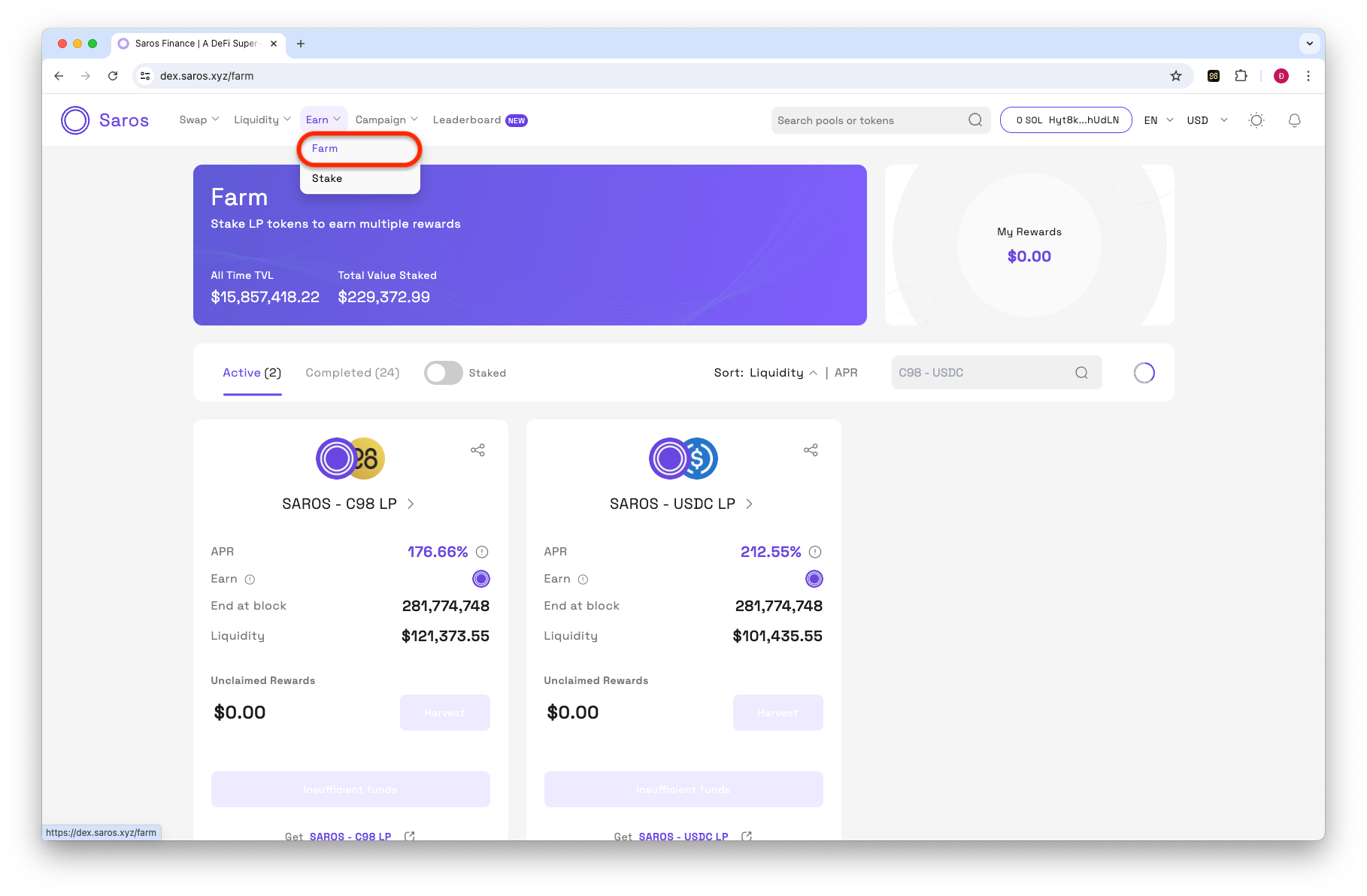 Saros Finance는 Solana 체인에서 운영되므로 SPL 표준 토큰만 파밍할 수 있습니다.
