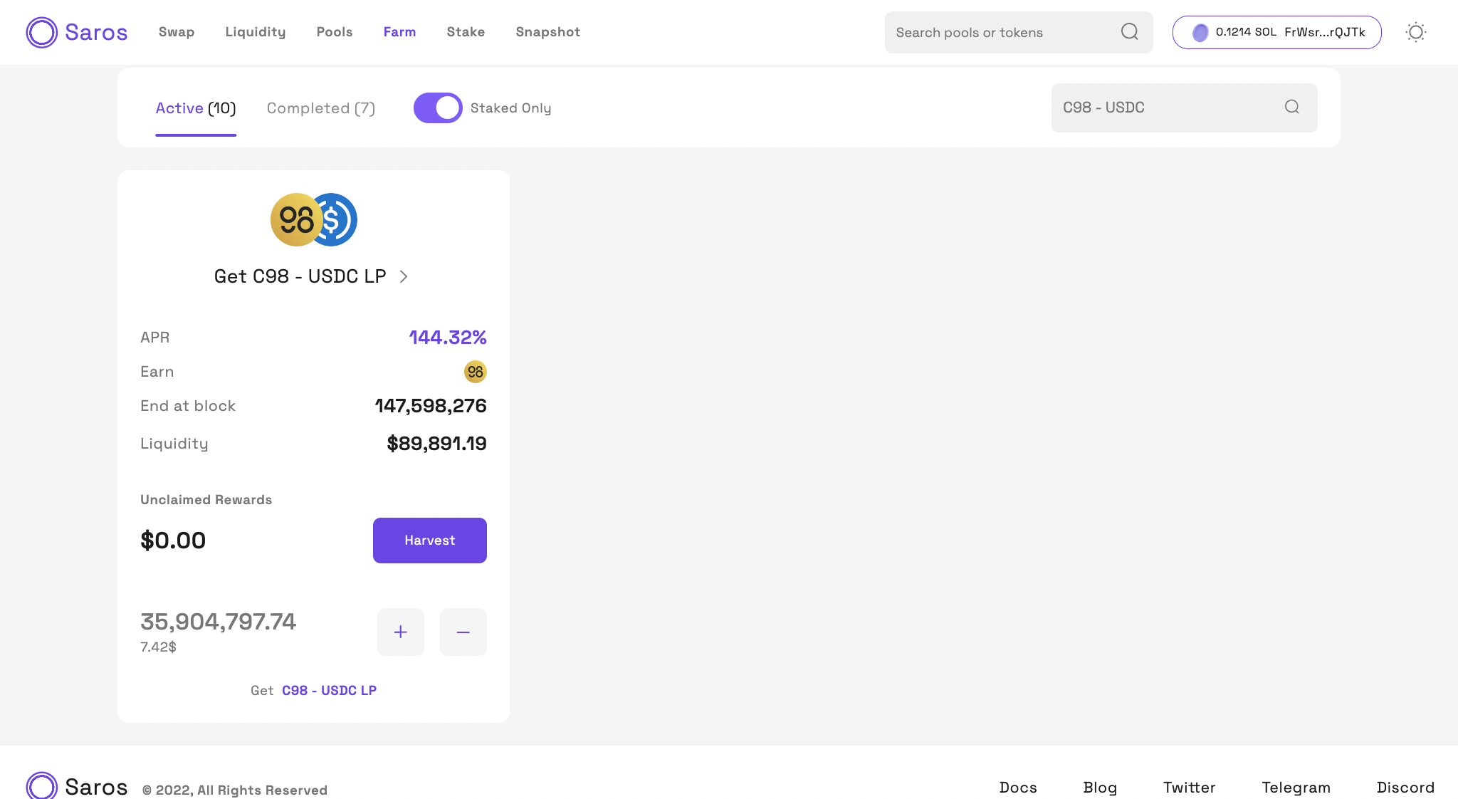 Step 1: 스테이킹을 하기 전에, 지갑에 LP 토큰이 있어야 합니다. LP 토큰을 보유하려면, “Saros Finance에서 유동성 추가하기(How to add liquidity on Saros Finance)”를 참고하세요.