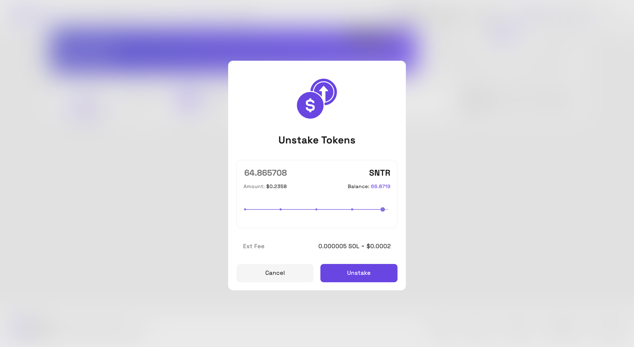 Step 2: 언스테이킹할 토큰 수량을 선택하고, 가스비(Gas Fee)를 확인한 뒤 -> Unstake 버튼을 클릭합니다.