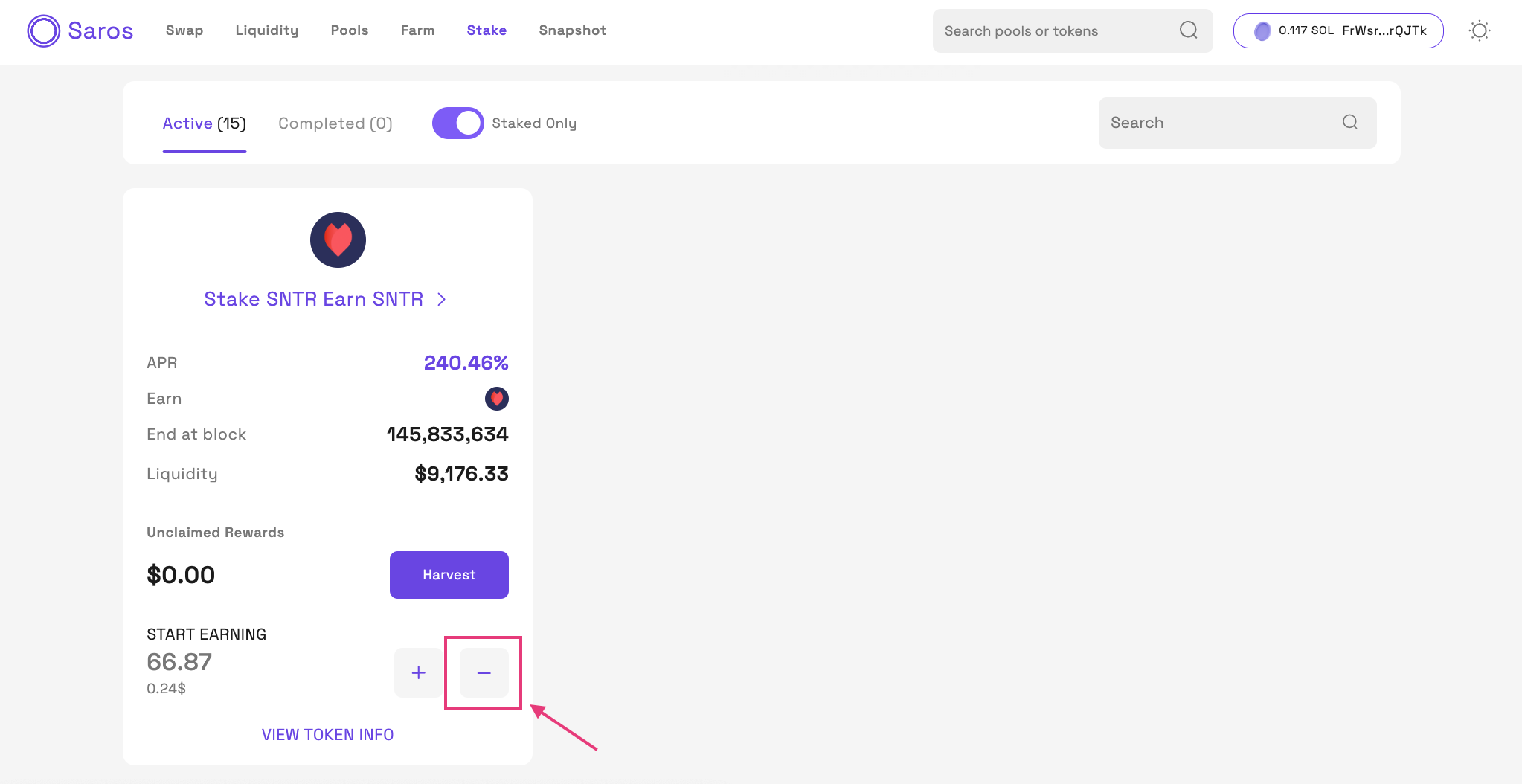 Step 1: 언스테이킹할 풀(Pool)을 선택합니다. 언스테이킹하려면 “-” 버튼을 클릭합니다.