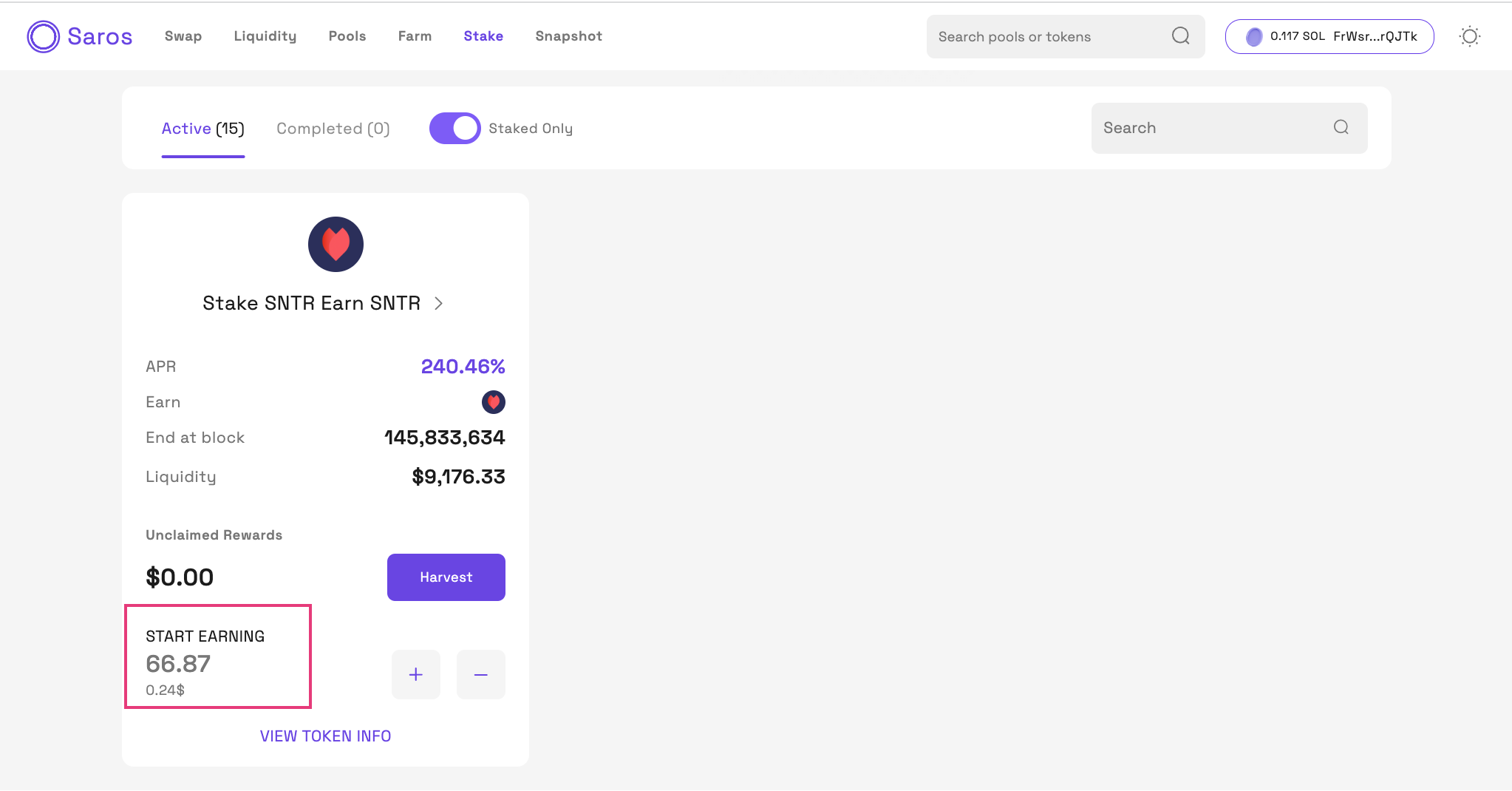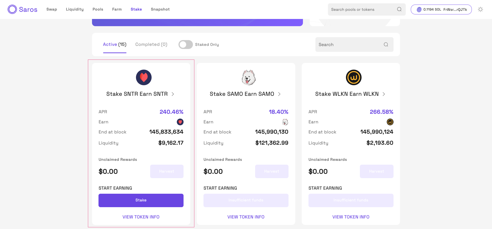 Step 1: Active 탭에서 원하는 풀을 선택 -> Stake 버튼을 클릭합니다. 이 튜토리얼에서는 SNTR 풀을 예시로 사용합니다.
