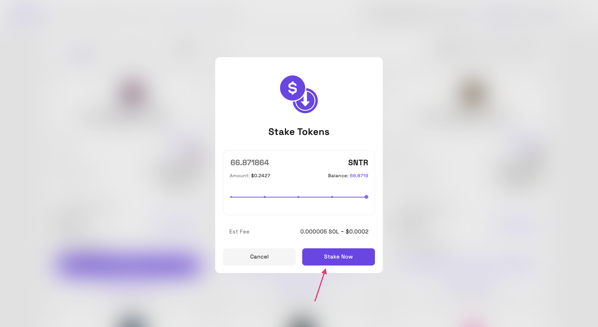 Step 3: 스테이킹할 토큰 수량을 선택하고, 가스 수수료를 확인한 후 -> Stake Now 버튼을 클릭합니다.