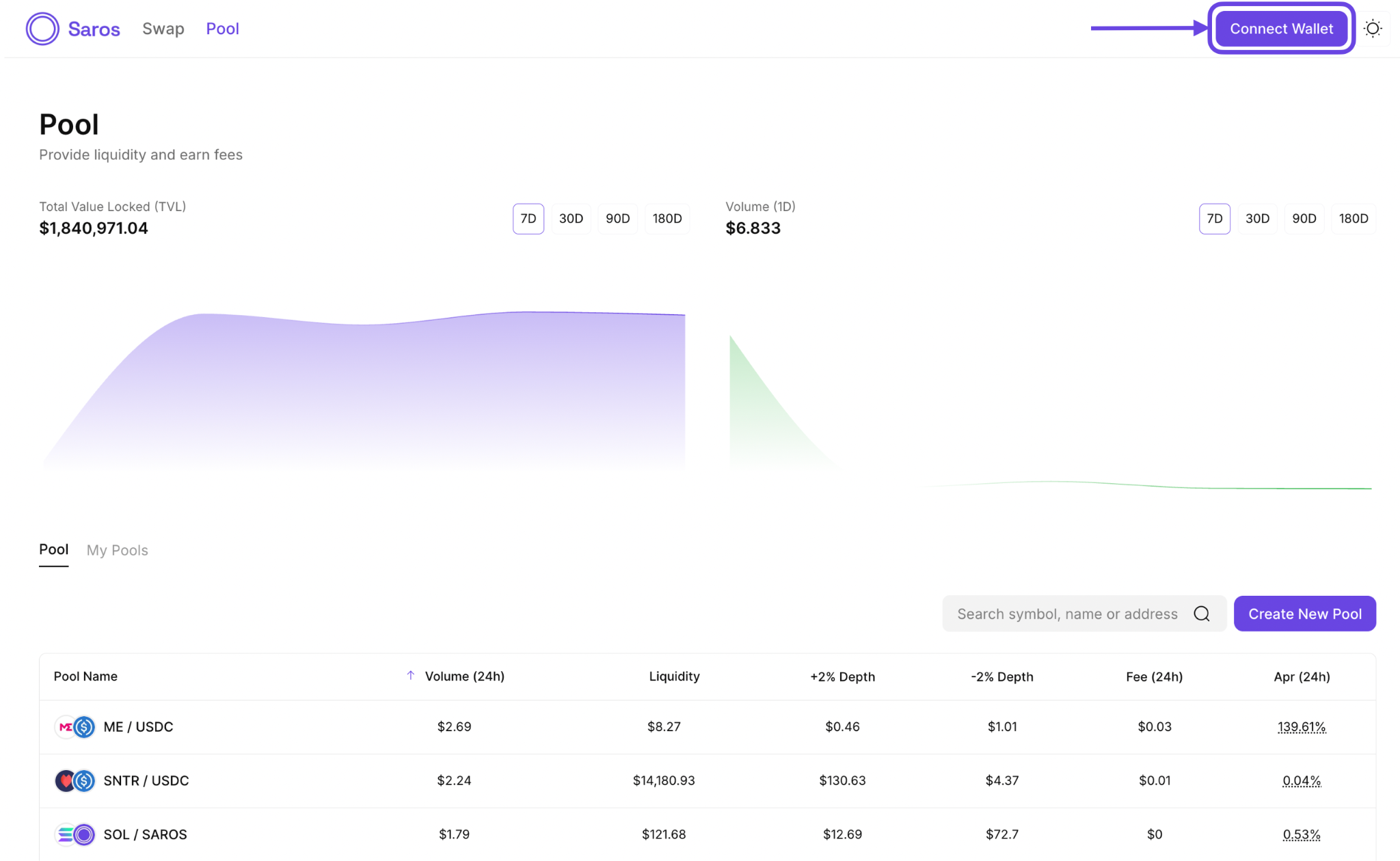 Step 1: https://dlmm.saros.xyz/pool에 접속하거나 메뉴 바에서 Pool 탭으로 이동한 후, 지갑을 연결하세요.