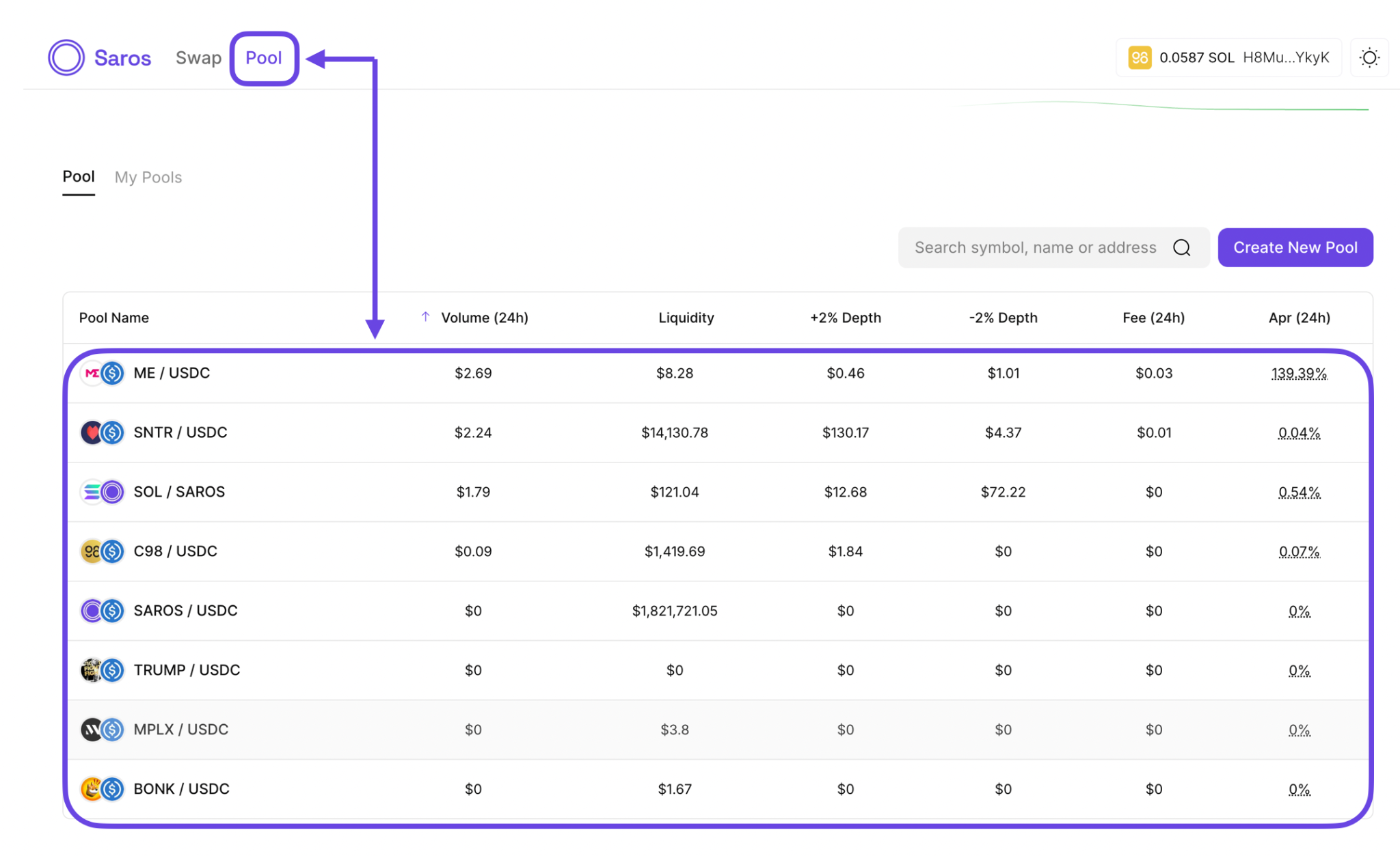 Step 1: https://dlmm.saros.xyz/pool링크를 통해 Saros DLMM 풀에 접속하거나 메뉴 바에서 Pool 탭으로 이동하세요.
