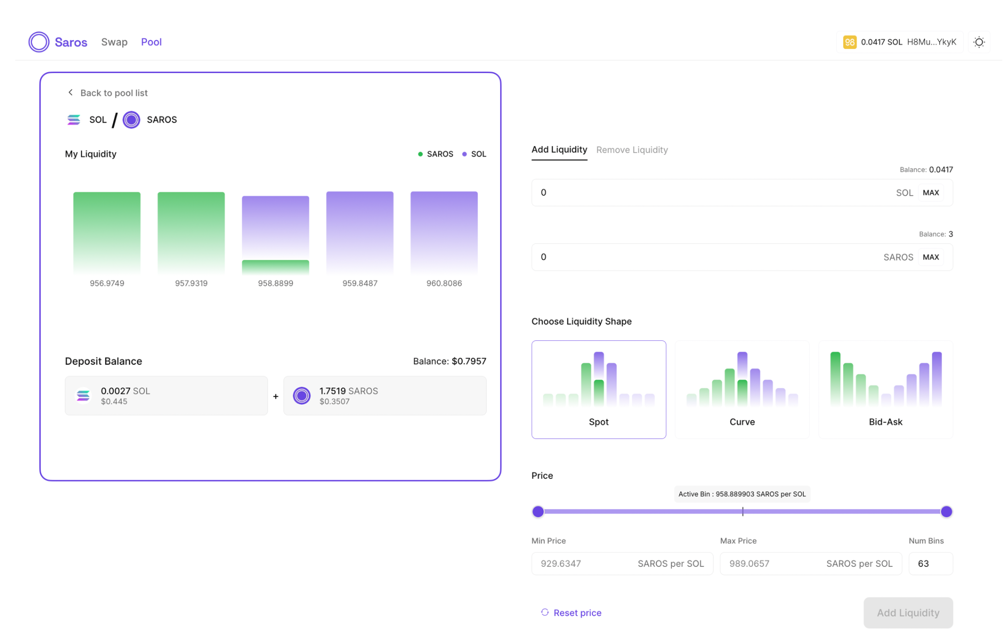 Saros DLMM 풀에 유동성을 추가하면 거래 수수료를 얻을 수 있으며, 유동성을 제거하면 전략을 조정하거나 포지션을 종료할 수 있는 유연성을 제공합니다.빈 기반 아키텍처를 통해 다양한 형태(Spot, Curve, Bid-Ask)를 사용하여 유동성 분포를 맞춤화할 수 있습니다.