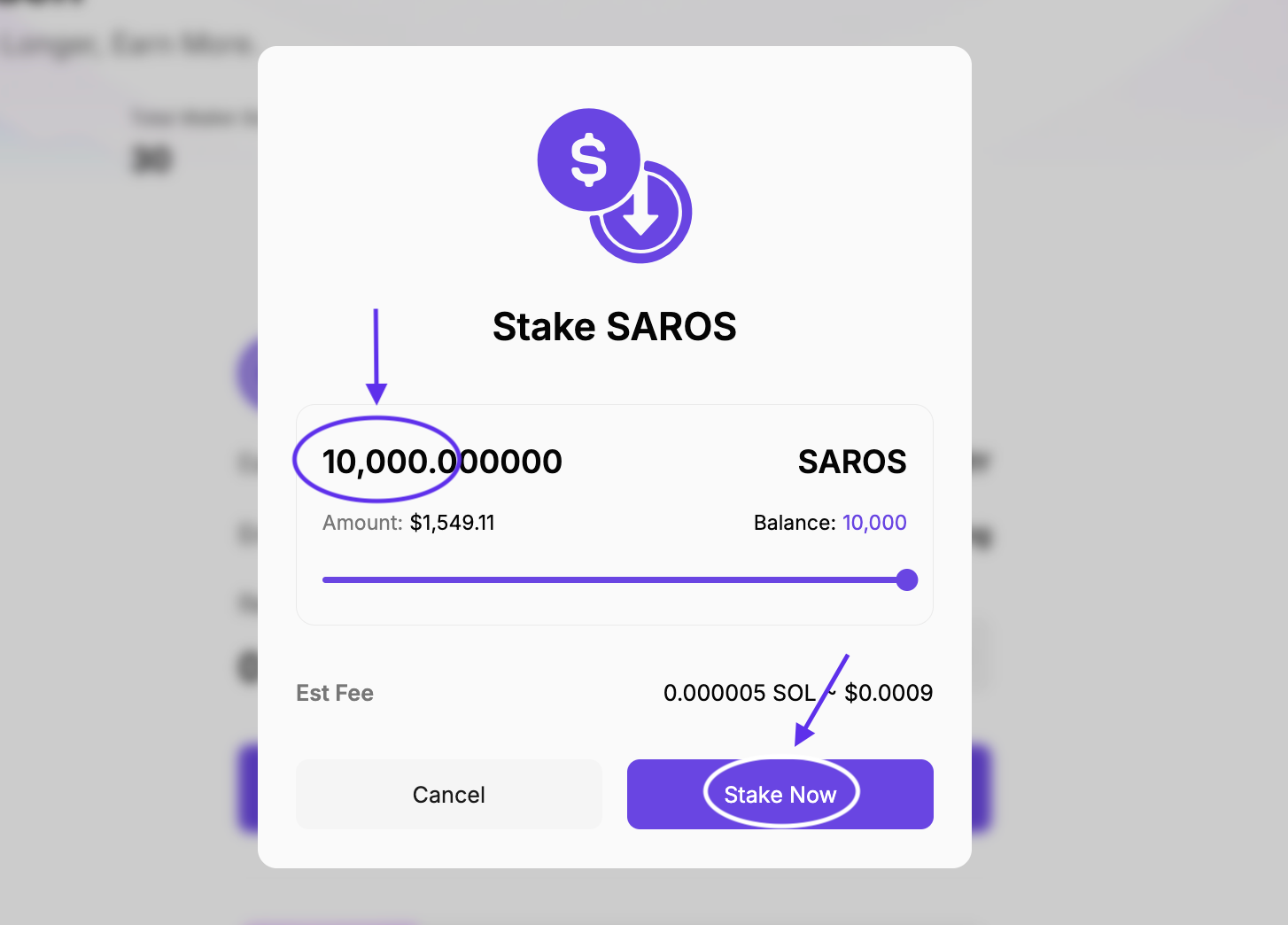 Step 3: 스테이킹할 토큰 수량을 입력한 후, Stake now 버튼을 클릭합니다.