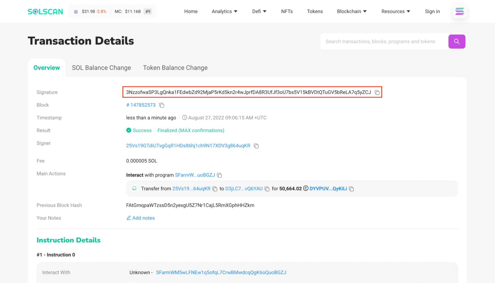 **Step 4**: Afterwards you will be redirected to a Solscan page. Choose to copy the transaction signature. That will be your farming pool Txid.