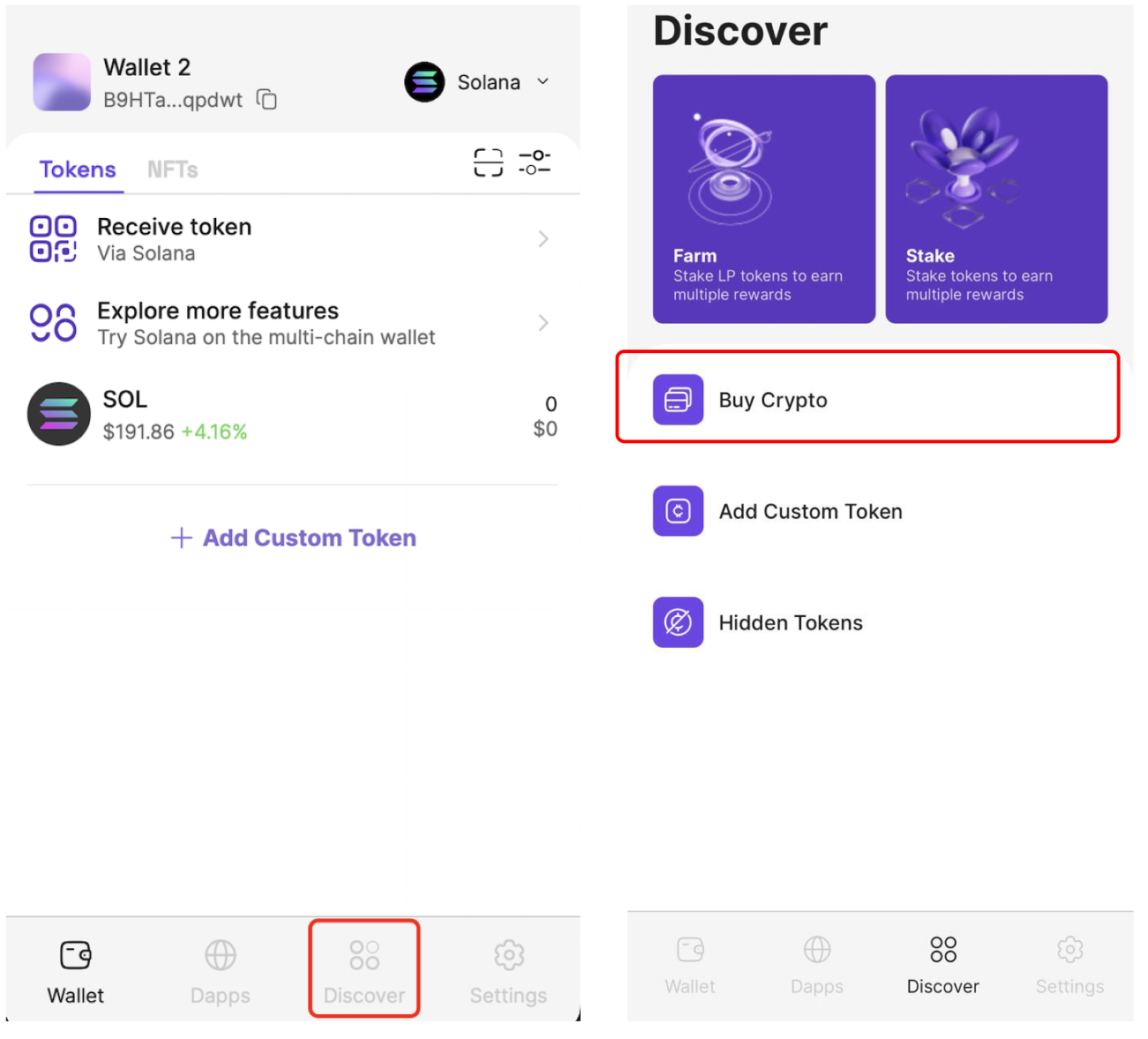 * **Step 1**: On the navigation bar, click on **“Discover“** tab, then click on the **Buy Crypto** section