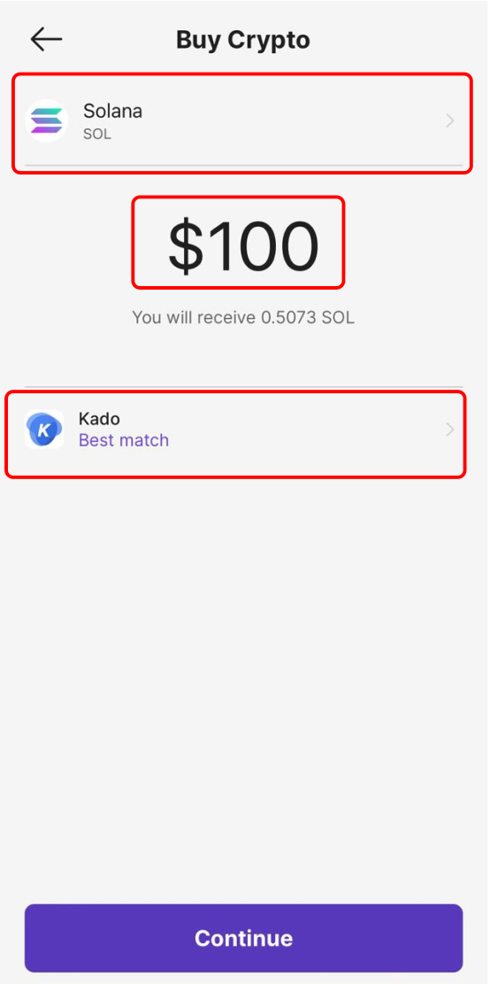 This feature allows users to buy crypto on the Solana chain with 2 providers: Kado and Transak. The provider that helps users get more tokens will be ranked at the top with the label “Best Match“.